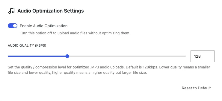 The Enable Audio Optimization toggle determines whether your audio files should undergo compression when uploaded. If you prefer to keep the original file untouched, this option can be switched off.