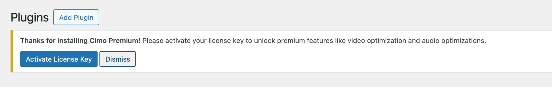 After purchasing Cimo Premium or the All Access Pass, you will be given a license key. This license key is used to activate the premium features of Cimo, such as video optimization, audio optimization and premium plugin updates.