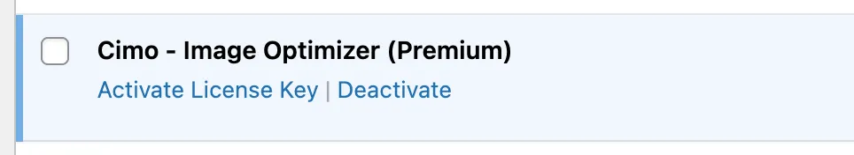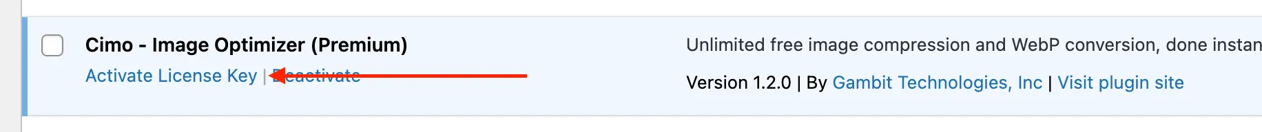 Alternatively, head over to your plugins admin page then scroll down to the entry for Cimo. Click on the link below the plugin name that says Activate License Key, then enter your license key and follow the prompt that appears.