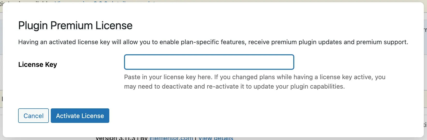 A popup modal should appear. Enter your license key then click on the Activate License button.