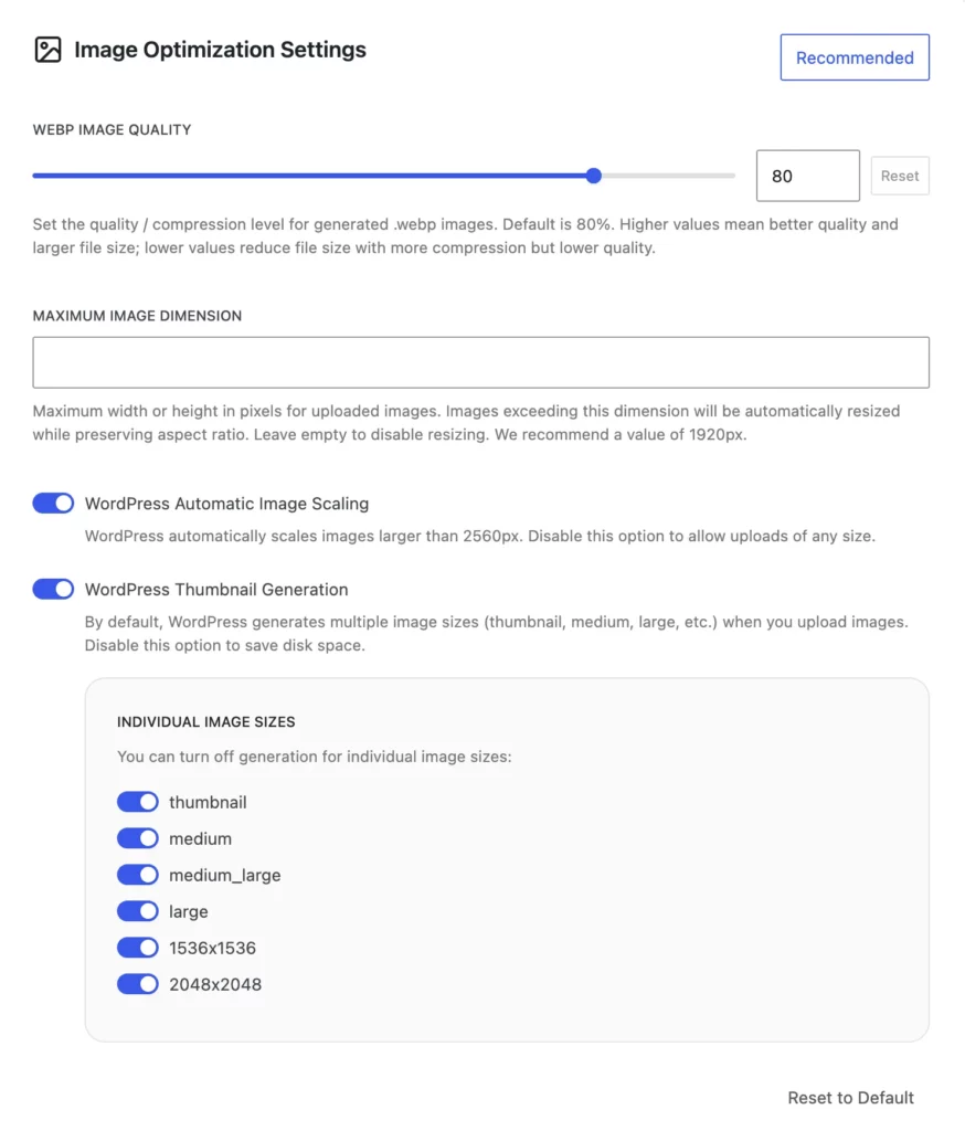 If you want to revert your changes, you can use Reset to Default button to restore all image optimization settings to their original values.